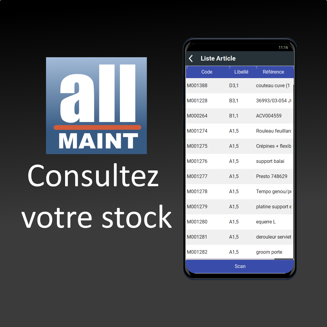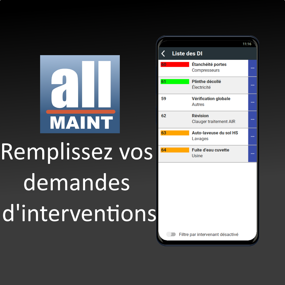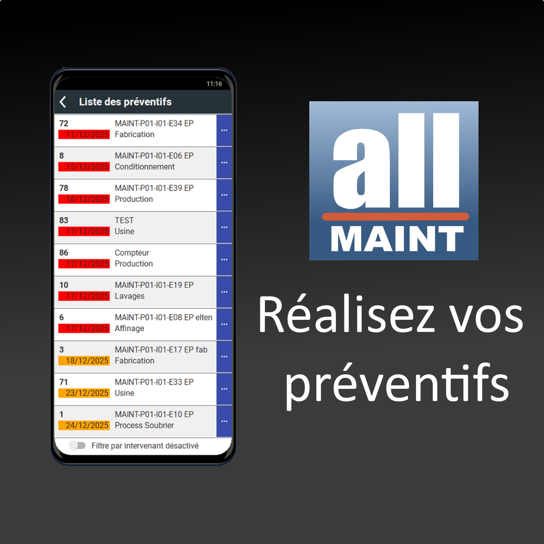 allMAINT Mobile est l’application mobile du logiciel de GMAO allMAINT, conçue pour permettre aux techniciens de gérer la maintenance directement depuis un smartphone Android. Elle réduit les tâches administratives, facilite l’accès aux données essentielles et permet de travailler en mode connecté ou hors ligne avec synchronisation ultérieure des données.